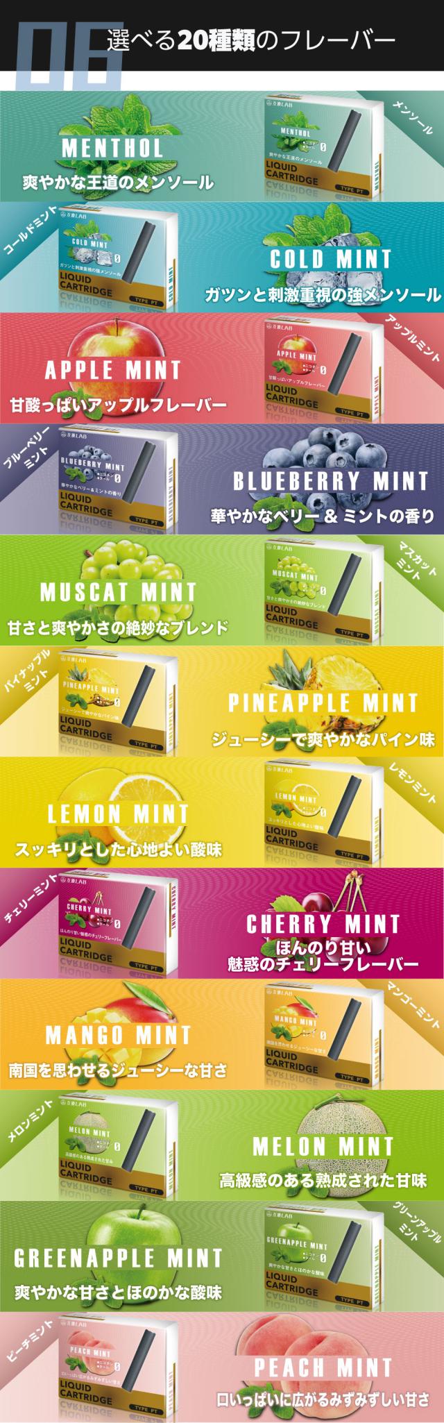 ・ミント:爽やかな後味で人気のミントフレーバーはフルーツ系のイエローやマスカット、レッドとの相性抜群です。