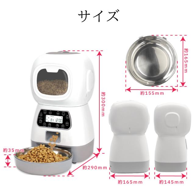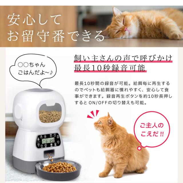 自動給餌器 自動餌やり機 猫 犬 【給餌器 おすすめ No1】オートペットフィーダー 5g単位 定時定量 音声メッセージ録音機能 3.5L タイマー設定 1日4回 2way給電 ステンレス皿 ペットフード ペット用