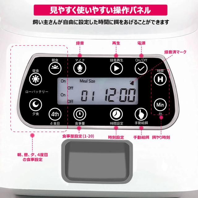色々設定できるのはいいけど、機械操作は苦手…なんて飼い主さんにも安心の簡単操作。見やすい大きめのディスプレイで複雑な操作は一切ありません。朝、昼、晩、4食目と分かれたアイコンボタンで、設定もラクラク。