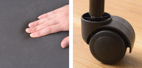 | クッション性のある座面 クッション性があり疲れにくい座面です。 | キャスター付き 移動がしやすいキャスター付きです。 |