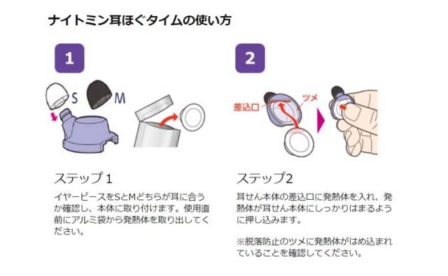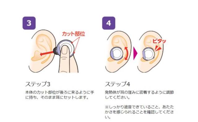 1.イヤーピースをSとMどちらが耳に合うか確認し、本体に取り付ける使用直前にアルミ袋から発熱体を取り出す