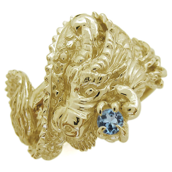 10金 アクアマリンサンタマリア 龍 リング メンズ 指輪 ドラゴン