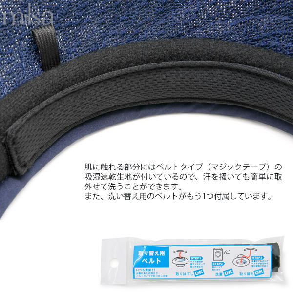 洗濯機で洗えるシリーズから、風に飛ばされにくいサンバイザーを入荷しました。メッシュ生地を重ねたツバ部分は、通気性に優れ蒸れにくく風の抵抗も受けにくい構造で、さらにUVカット率は90%以上なっています。お肌にあたる内側の部分は、吸湿速乾生地になっているので汗をかいてもサラサラと快適に過ごせます。また、この吸湿速乾生地はベルトタイプ(マジックテープ)で付いているので簡単に取外せて洗うことも可能です。さらに、取り換え用ベルトがもう1つ付属します。頭に挟み込むクリップバイザータイプですが、取り外し可能なあご紐も付属しているので、風の強い日でも安心して被れます。