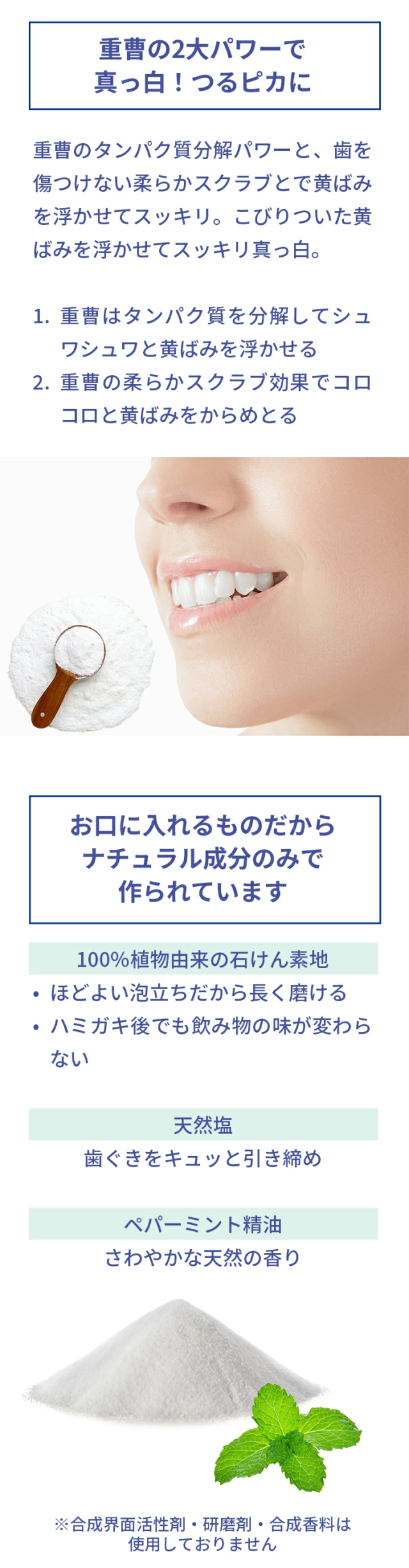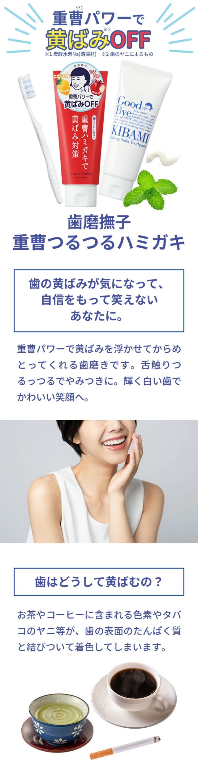 重曹ハミガキで黄ばみ対策。黄ばんだ歯では、にっこり笑顔も可愛さ半減。歯の黄ばみが気になって自信をもって笑えない。そんなあなたに。ピカピカ輝く白い歯で笑顔かわいいべっぴんちゃん。 |