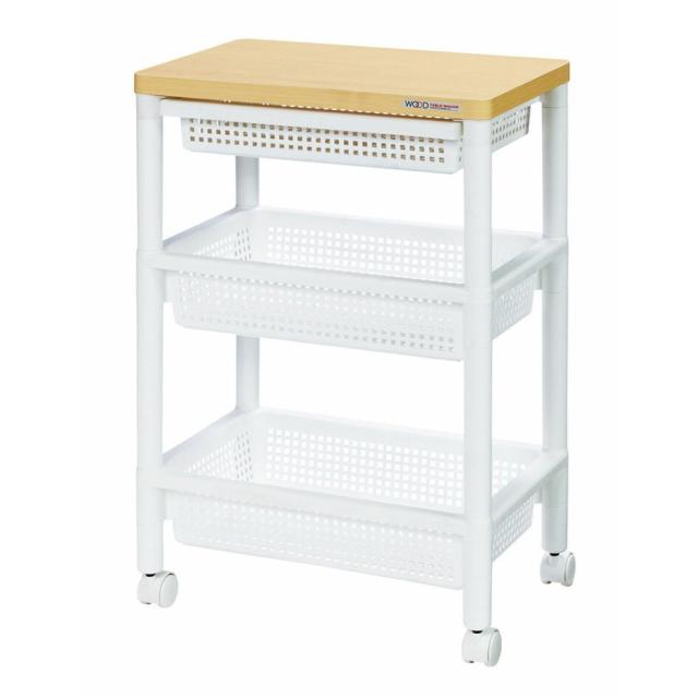 ウッドテーブルワゴンWTW-3H(WH) 引き出しバスケット付 ホワイト1 キッチンワゴン 3段 キャスター付き