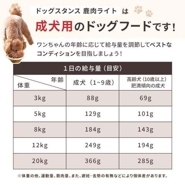 成犬用のドッグフードのドッグスタンス鹿肉ライトで、ワンちゃんのベストなコンディションを目指しましょう。