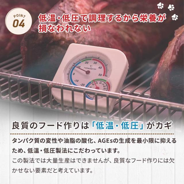 タンパク質の変性や油脂の酸化、AGEsの生成を最小限に抑えるため、低温・低圧製法にこだわっています。