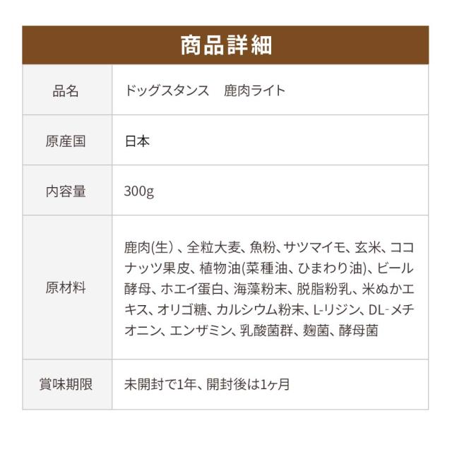 ドッグスタンス 鹿肉ライトは、国産野生鹿肉、エンザミン配合、無発砲製法、国内製造です。