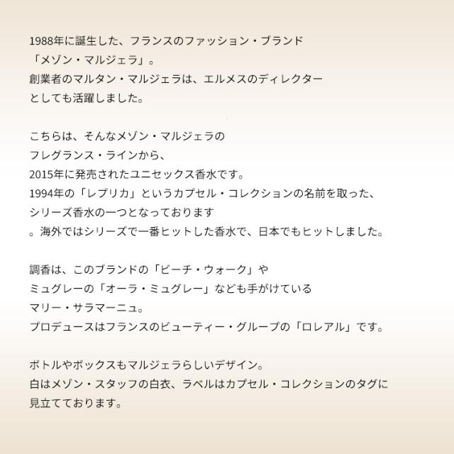 1994年の「レプリカ」というカプセル・コレクションの名前を取った、シリーズ香水の一つとなっております。海外ではシリーズで一番ヒットした香水で、日本でもヒットしました。