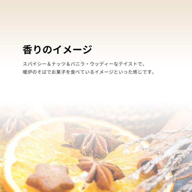スパイシー&ナッツ&バニラ・ウッディーなテイストで、暖炉のそばでお菓子を食べているイメージといった感じです。