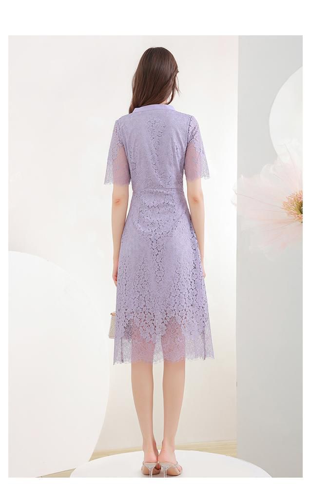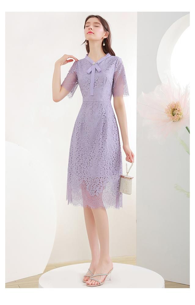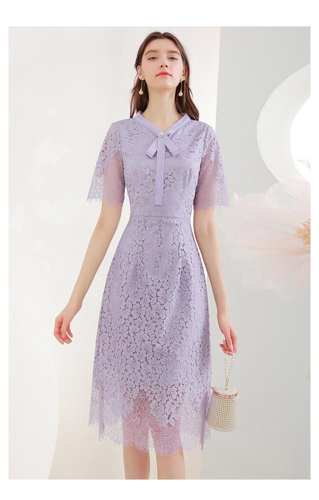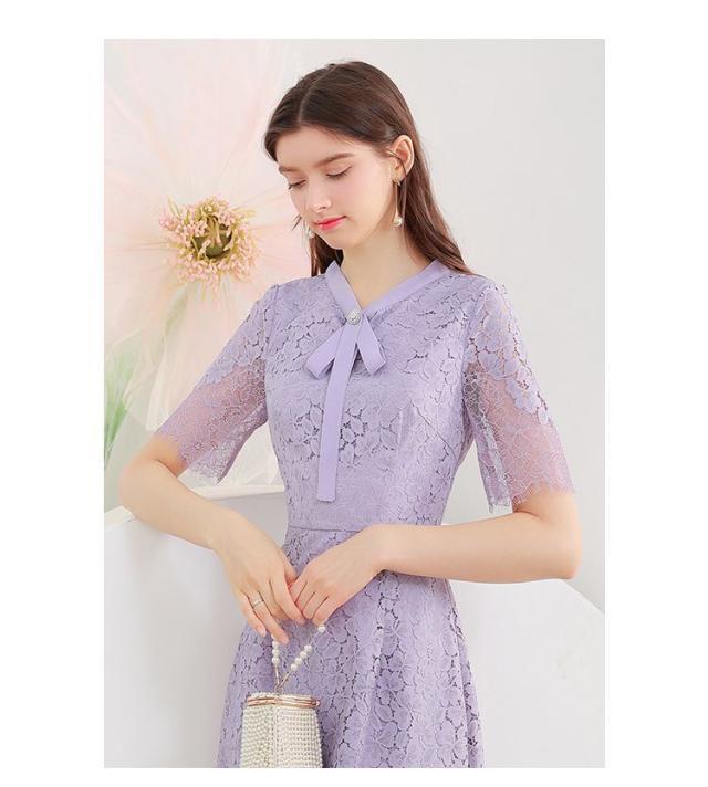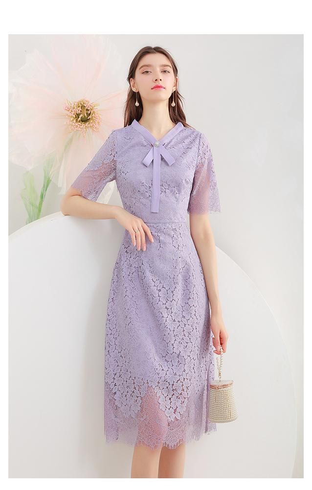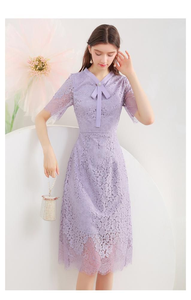 ワンピース 花柄レース 半袖 透け感 とろみ ボウタイリボン ウエストシェイプ 膝丈ワンピース ロマンティック 甘め お出かけファッション
