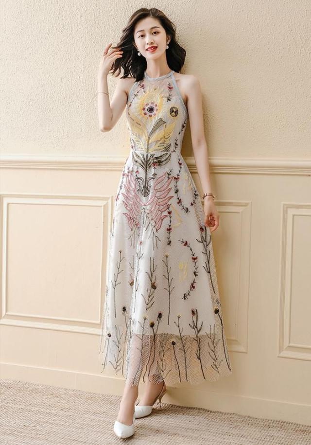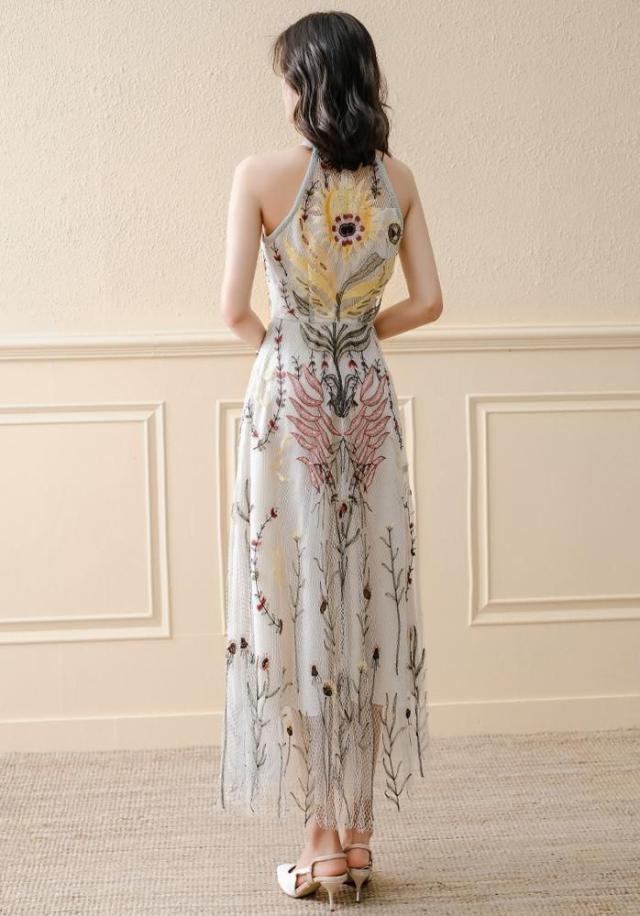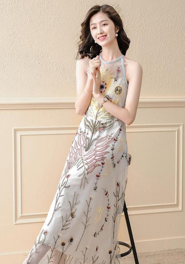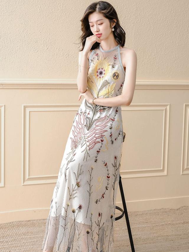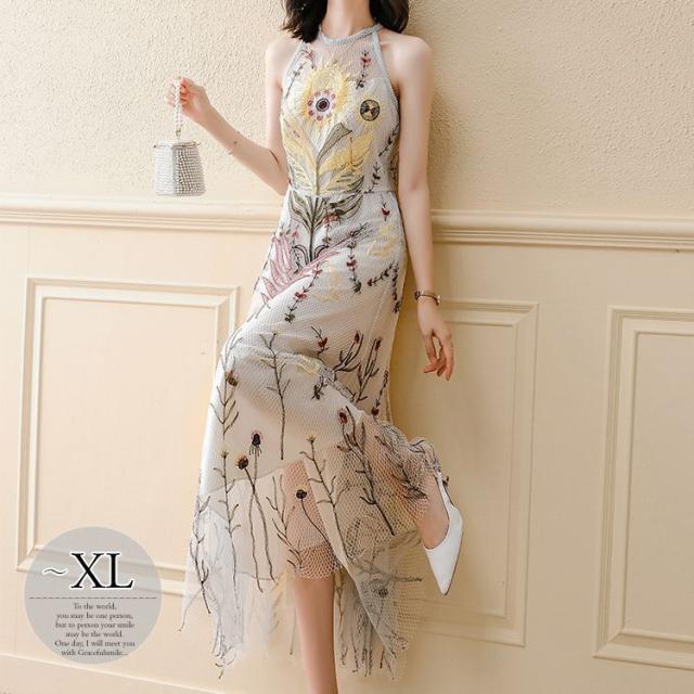 ドレス ラウンドネック 花柄 ノースリーブ レース 透け感 フレア ロングスカート セレブスタイル 優雅 披露宴 フェミニン きれいめ