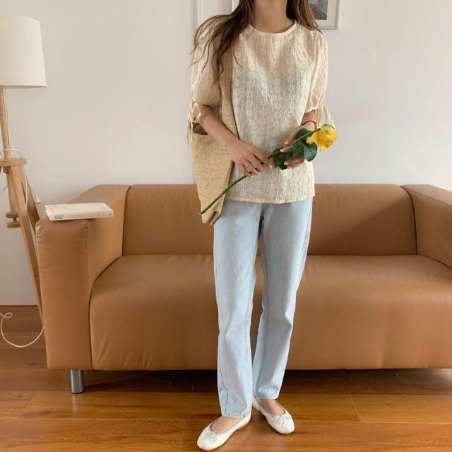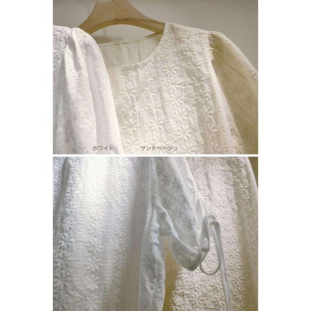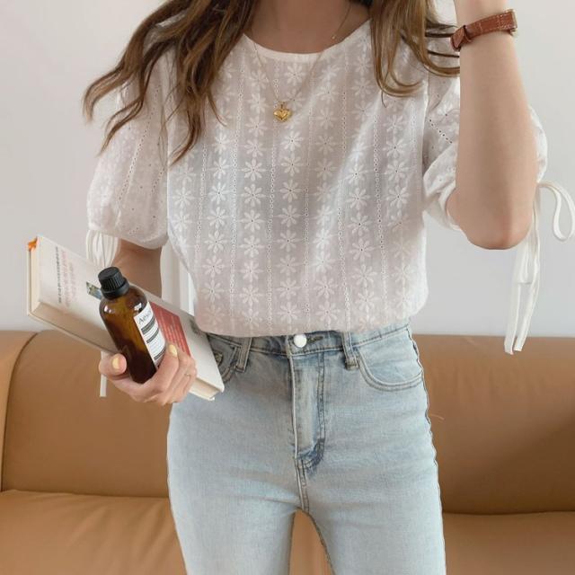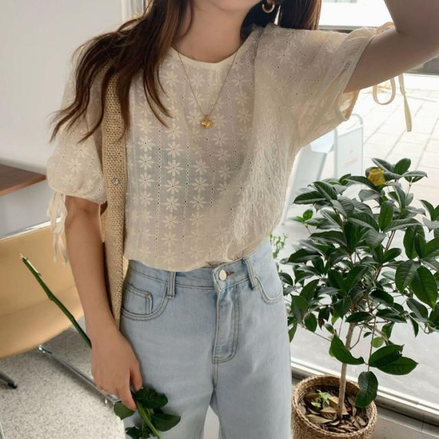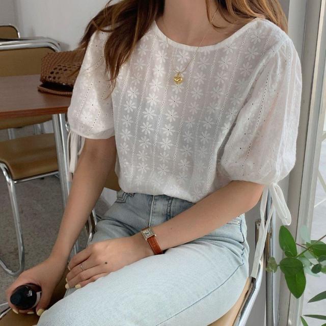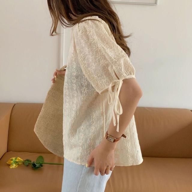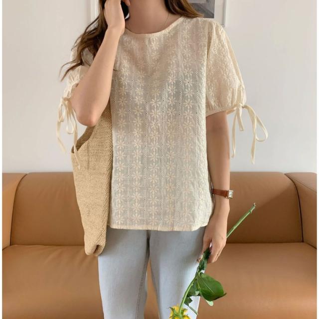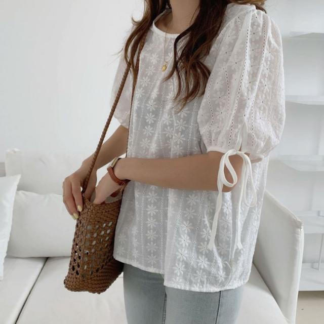 ブラウス レース レディース トップス 半袖 花柄 刺繍 ケミカルレース シースルー リボン付き 韓国ファッション メール便