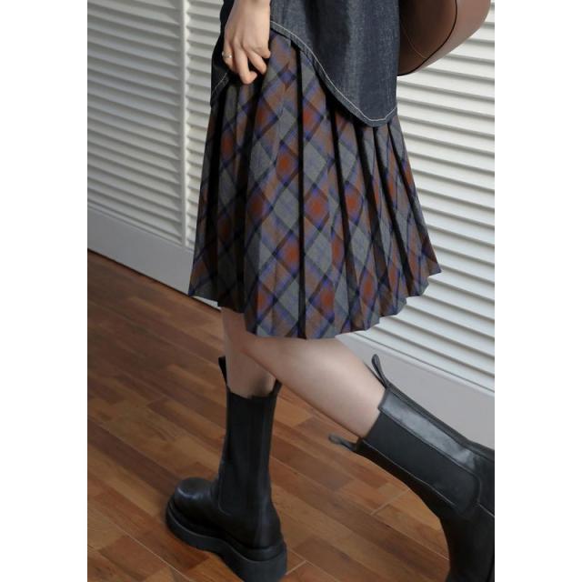 スカート レディース ボックスプリーツスカート チェック柄 格子柄 フレア裾 台形スカート カジュアル レトロ スクール風 膝丈 配色デザイン