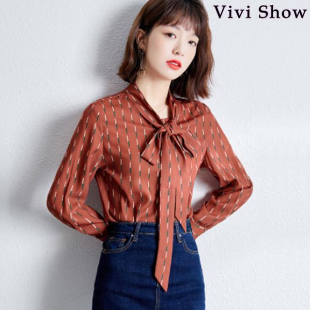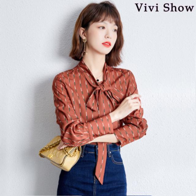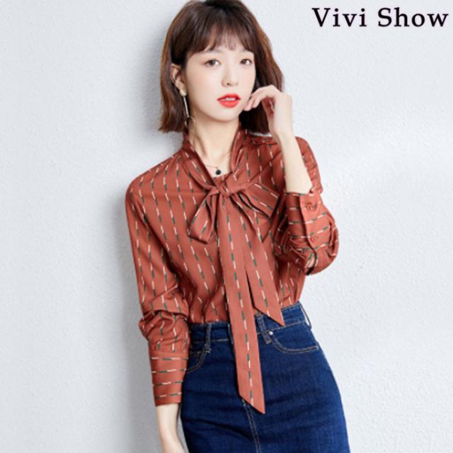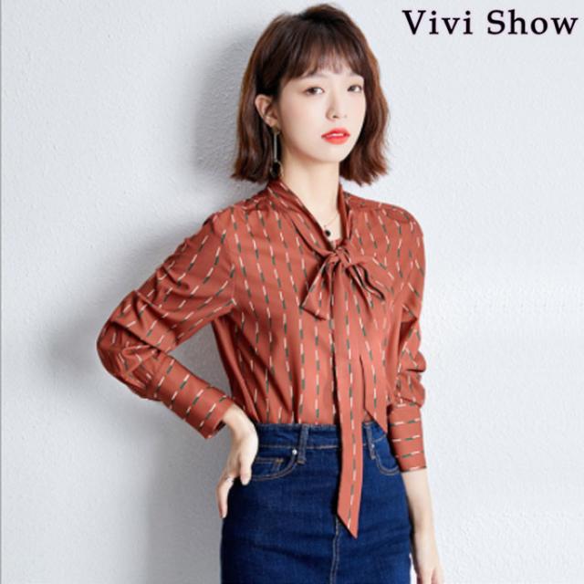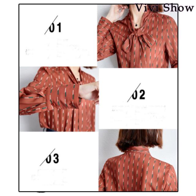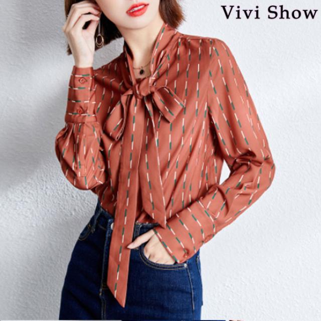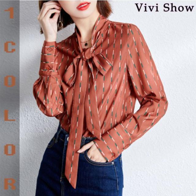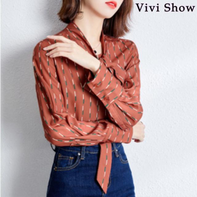 レディース シャツ リボンタイ ブラウス 総柄 シフォン 長袖 柄シャツ 通勤 OL ボウタイ カジュアル 春夏