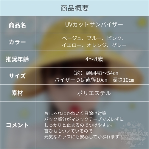 | サイズについての説明 | カラー:ベージュ、ブルー、ピンク、イエロー、オレンジ、グレー 推奨年齢:4〜8歳 サイズ: (約)頭囲48〜54cm バイザーつば直径10cm 深さ10cm |