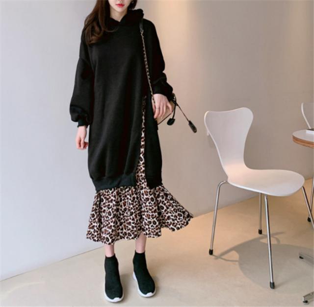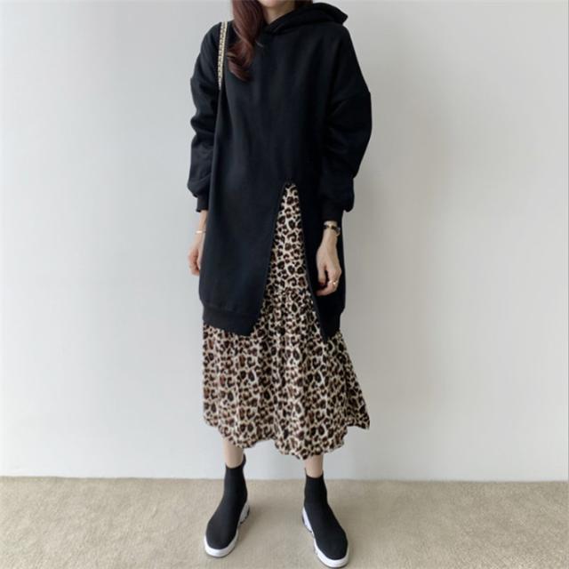 フェイクレイヤードパーカーワンピース ロングワンピース スウェットパーカーワンピース フード付き 体型カバー レディース 春 秋 冬 大きいサイズ 切り替え