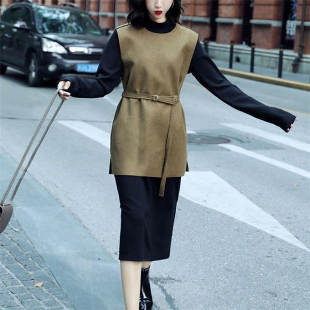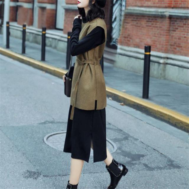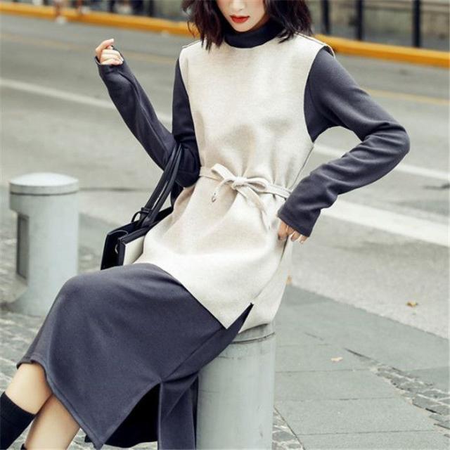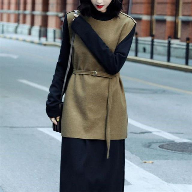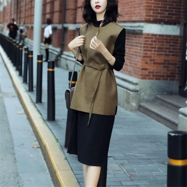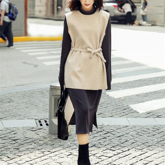 ワンピース ベストセットワンピース セットアップ レディース ラシャベスト レイヤード ニットワンピース 長袖 ベルト付き 無地 スリットワンピ 着重ね 可愛い