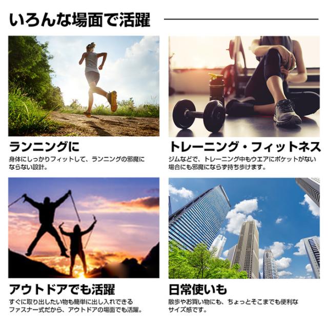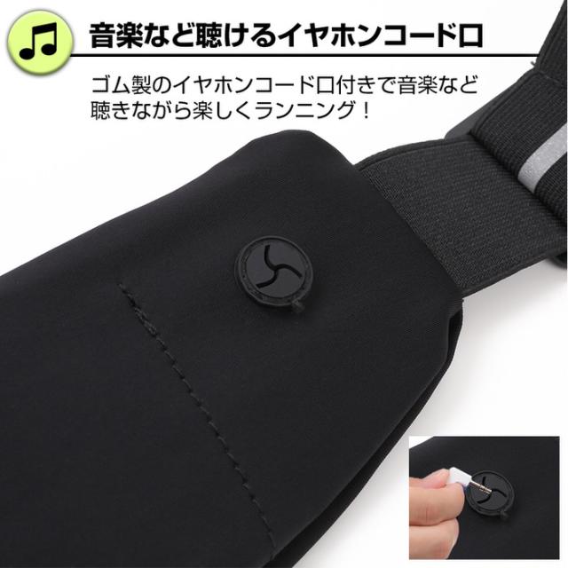 コンパクトながらもスマホやカード、鍵などの小物類やイヤホンなどランニングに必要なグッズは収納できる大きさで、大きすぎないためランニング中の荷物の揺れを防ぎます。ポーチ裏面にはイヤホンホールがついており、音楽を聴きながらのランニングも可能です。