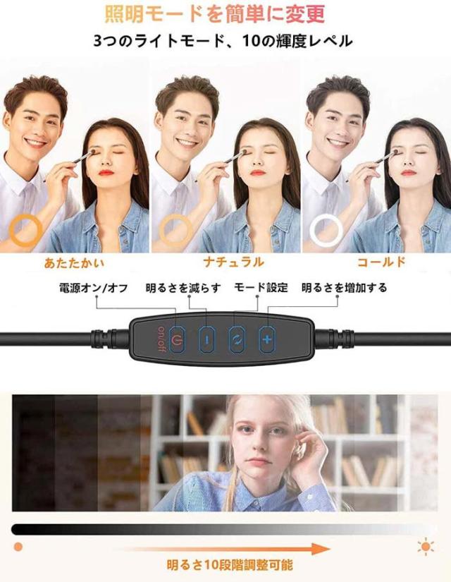 商品説明 | 撮影用ライトは自由雲台が付きで、方向を光の角度を調節したり、好きな角度をしっかりロックし、360°まで自由に調整可能、また左右の方向も可動。 コントローラーは、フィルライトを直接オンにし、モードを変更し、ライトレベルを制御することができます,完璧な補光効果が得られます。 コンパクトで持ち運びでき、とても便利です。 直径16cmのLEDリングライトは省エネで高輝度の48個のLEDビーズを採用しており、均一で安定した光出力を放ちます。 自撮りライトには暖かい、暖かい白、白の3つの明るい色があります。 各照明モードには10の異なる明るさがあります。 色温度は2200kから5500Kまで調整可能です。 鮮やかな色が独特の雰囲気を演出し、さまざまなニーズにお応えします。 スタンドライトフレームはアルミ製、クリップはメタル製で、重作業にも強く、変形を防ぎます。 底部にゴムが付いているので、傷や滑りの心配がありません。だから、どこでも素晴らしい写真やビデオを作成することができます。 このセルフィーリングライトをPCモニター、ベッド、デスク、オフィス、会議用テーブルなど、好きな場所にクリップするだけです。 明るく美肌に見せてくれるほか、瞳の中に明るいライトが映り込みますので瞳が輝いて見えます。 インターネット生放送 、ビデオ通話、自撮り、YouTube、Facebook、Twitter、Instagramなど様々なシーンで活躍。 |