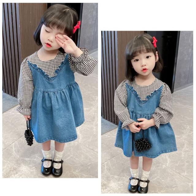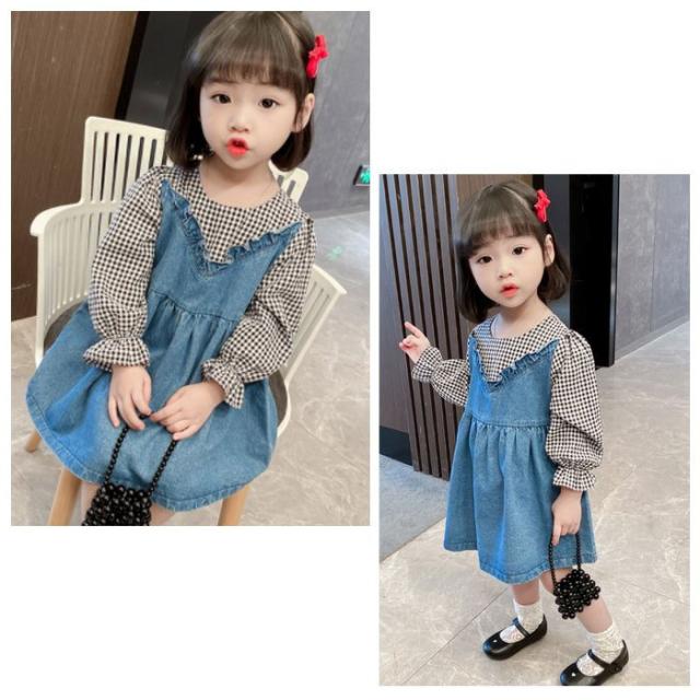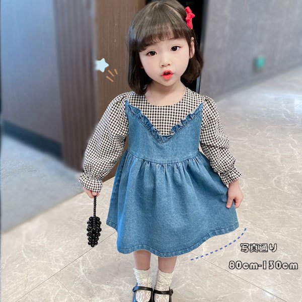 ワンピース ベビー服 アンサンブル チェック柄 オシャレ 女の子 ベビー ワンピース 長袖 デニムドレス 可愛い キッズ 幼児 通園 通学 春 秋 ブルー 80-130