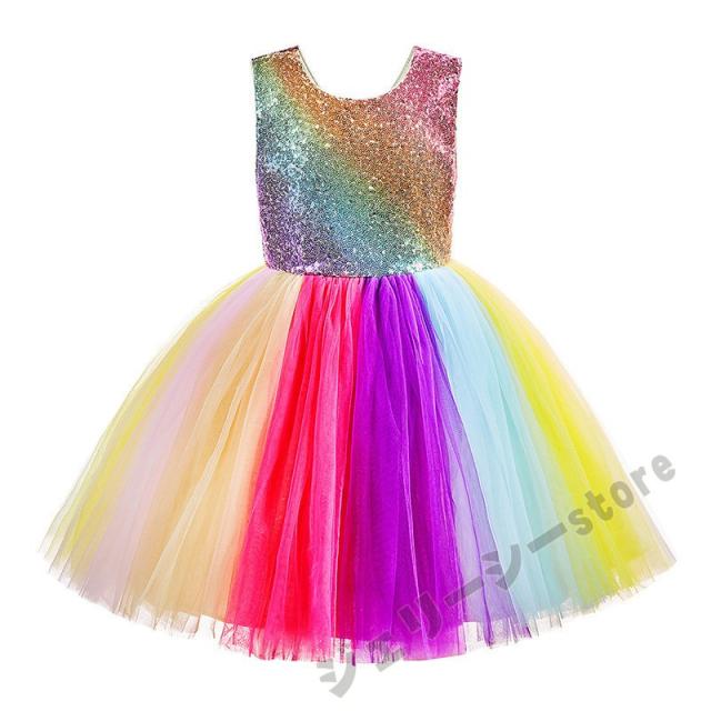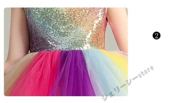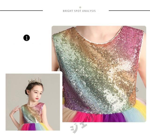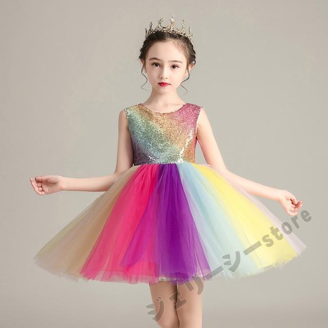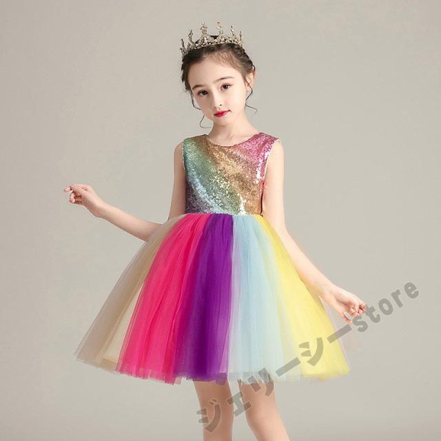 子どもドレス 3-15才 袖なし 虹色 スパンコール ひざ上丈 こどもドレス キッズドレス 子供 結婚式 発表会 フォーマル 子供ドレス