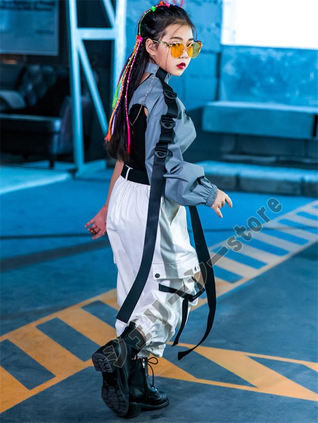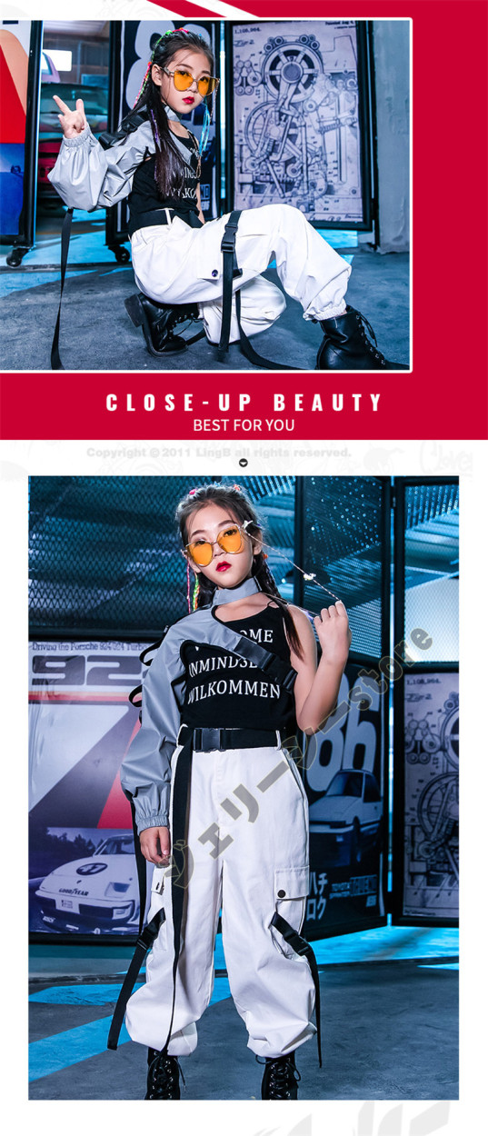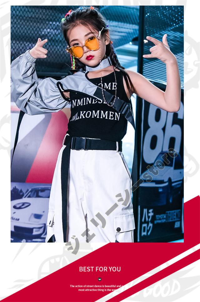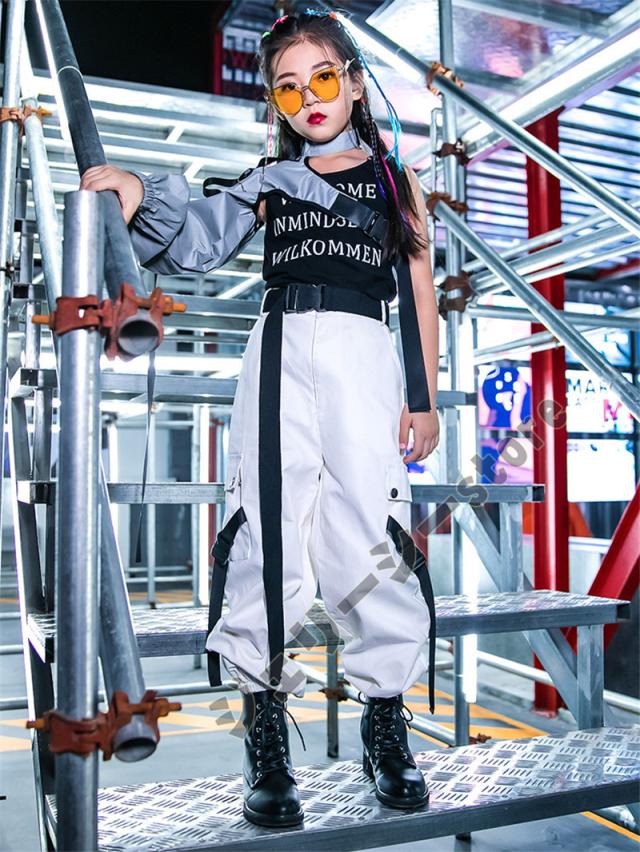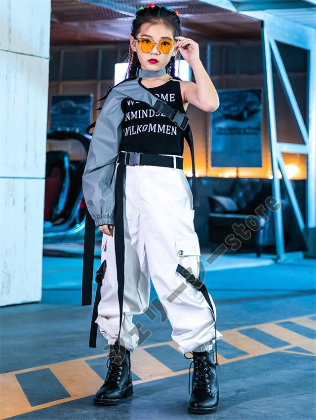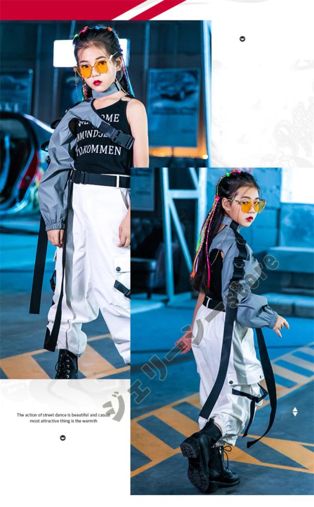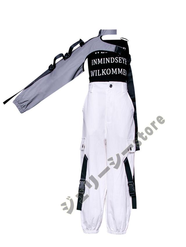 ワンショルダー キッズ ダンス衣装 セットアップ ベルト付き アームウォーマー 片腕 カーゴパンツ 子供服ステージ オシャレ