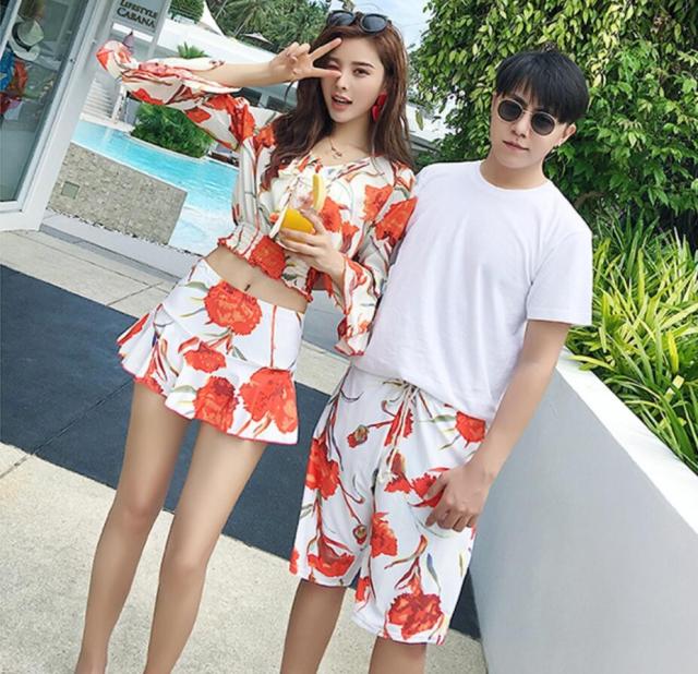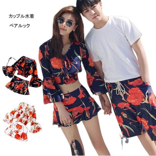 カップル水着 ペアルック レディース3点セット ビギニ メンズサーフパンツ ビーチパンツ ボーダー スイムウエア 恋人 夏休み 男女