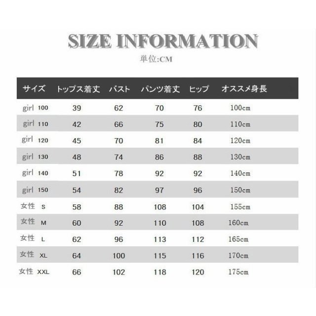 | サイズについての説明 | サイズ:(単位:cm) 子供:90/100/110/120/130/140/150/160 ママ:S/M/L/XL/XXL/3XL ババ:M/L/XL/XXL/XXXL/4XL |
