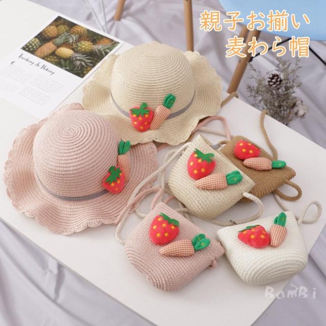 親子 お揃い 帽子 バッグ 3点セット 麦わら帽子 ショルダーバッグ 鞄 カバン ママ 女の子
