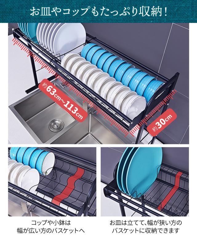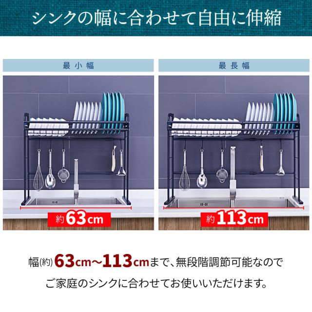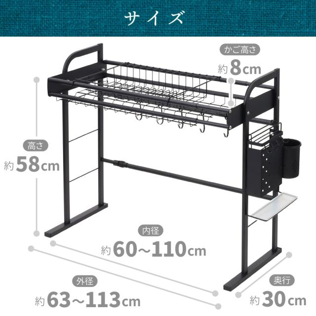 水切りラック シンク上 水切りかご 大容量 水切り スリム 幅60cm 〜 110cm 高さ58cm 伸縮 幅 調節 幅調節可能 黒 ブラック