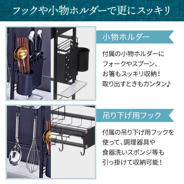 吊り下げ用フック付きなので、調理器具も収納できます。