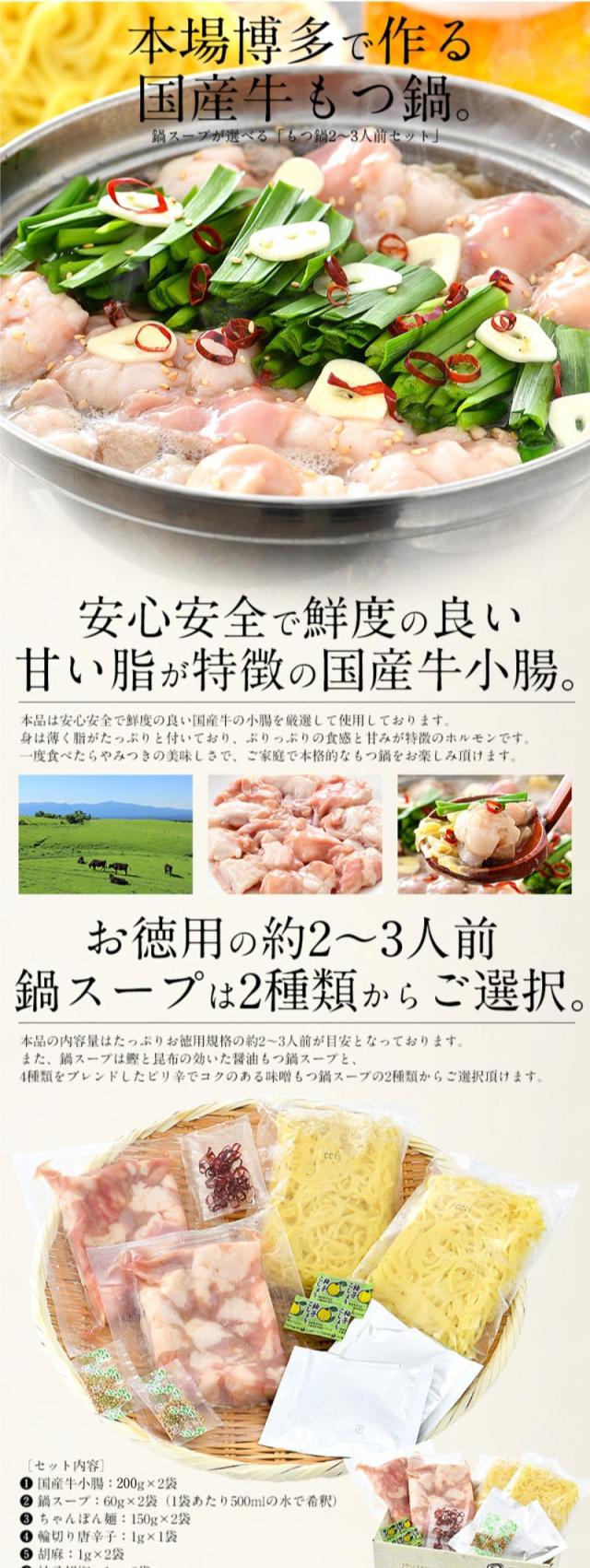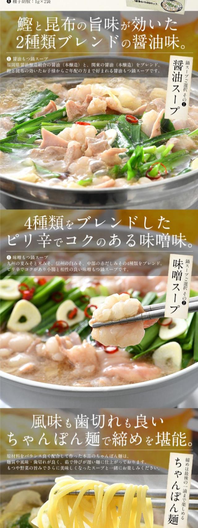牛小腸(国産)、鍋スープ・醤油(醤油(国内製造)、かつおだし、発酵調味料、みりん、昆布エキス、還元水飴、食塩、カツオエキス、砂糖/調味料(アミノ酸等)、酒精、(一部に小麦・大豆を含む))、鍋スープ・味噌(味噌(国内製造)、みりん、還元水飴、食塩、発酵調味料、鰹節エキス、砂糖、調製ラード、醤油、香辛料/調味料(アミノ酸等)、酒精、カラメル色素、甘味料(甘草)、(一部に小麦・大豆・豚肉を含む))、ちゃんぽん麺(小麦粉(国内製造)、澱粉、粉末卵白、植物性蛋白、食塩/かんすい、焼成カルシウム、クチナシ色素(一部に小麦・卵を含む))、輪切り唐辛子(中国産)、胡麻(白ごま)、柚子胡椒(ゆず皮(国産)、青唐辛子、食塩)
