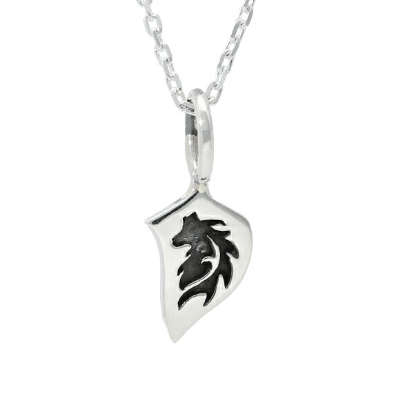 盾型のプレートの中心に狼の横顔のシルエットをアーティスティックに彫り込んだチャームペンダント。