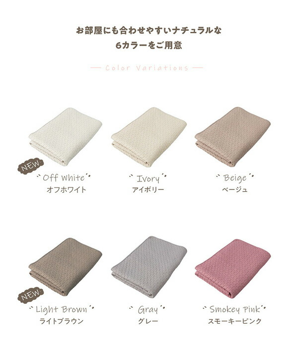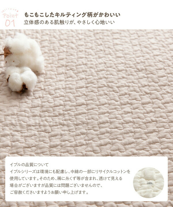 | 商品説明 | ●綿100%生地で、いつでもやさしい寝ごこち ●モコモコのキルティング柄がかわいく、立体感のあるやさしい触り心地 ●さらっとした肌触りでオールシーズン使用可能 ●洗濯できるので毎日清潔安心 ※製造時期により、質感・色味・デザイン・梱包形態など、品質に差し支えない程度の仕様変更を行う場合がございます。 ※イブルシリーズは環境にも配慮し、中綿の一部にリサイクルコットンを使用しています。そのため、稀に糸くず等が含まれ透けて見える場合がございますが品質には問題ございません。 ※タンブル(乾燥機)乾燥はお避けください。 ※洗濯ネットをご使用のうえ、単独洗いをお願いします。洗濯後は放置せず、すぐに形を整えて干してください。 ※無蛍光洗剤を使用してください。 ※この製品は色落ちする恐れがありますので、洗濯は白いものと一緒にしないでください。 |