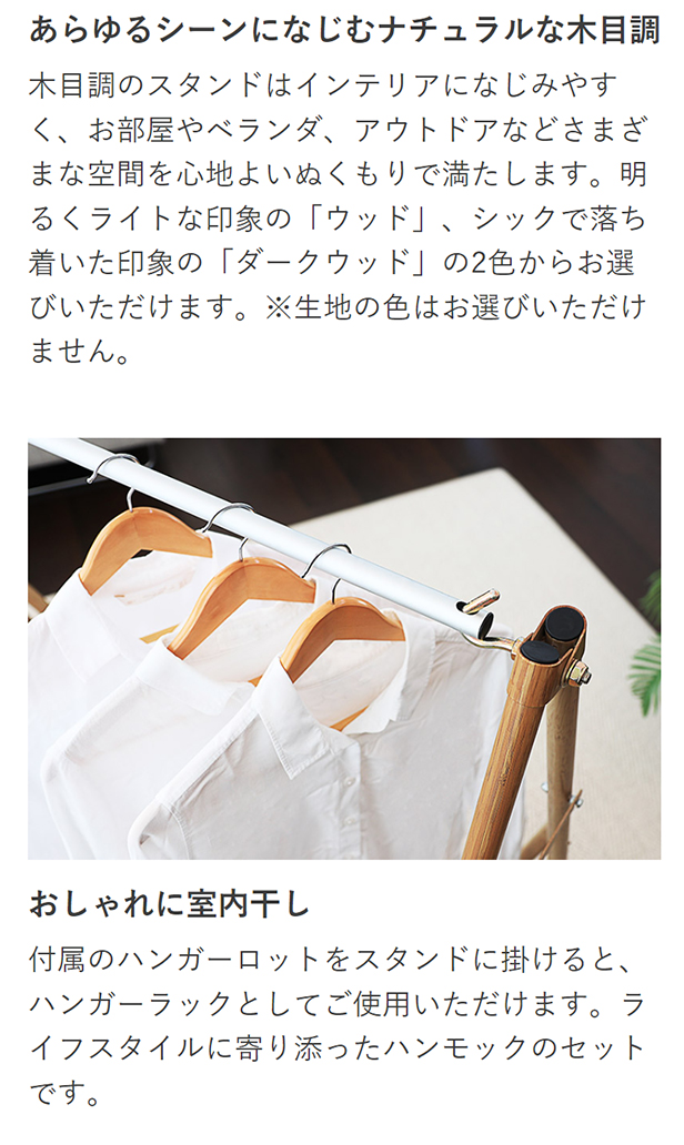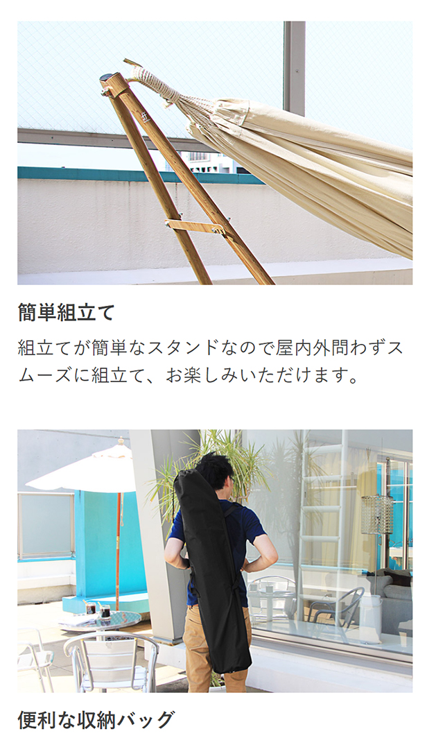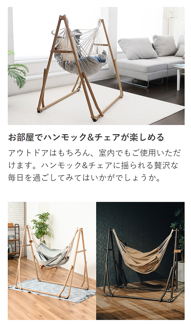 ハンモックとチェア、そしてハンガーラックの3WAYハンモックで贅沢な毎日をお届けいたします。お部屋によく馴染む美しい木目調のスタンドがポイントのハンモックセットはアウトドアはもちろんインテリアとしても十分楽しめます。スタンドの組立てが簡単に行なえるので、用途に合わせて様々なシーンでお使いいただけます。