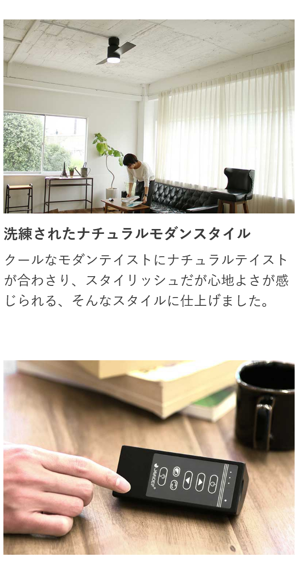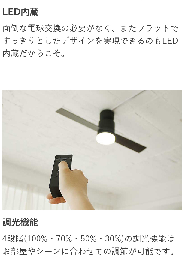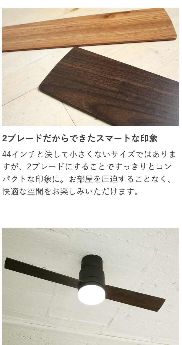 44インチと決して小さくないサイズ、さらには重厚感のあるボディですが、LEDチップ内蔵、2ブレードを採用することで、ファンを回していないときでも圧迫感のない美しい直線が生まれました。