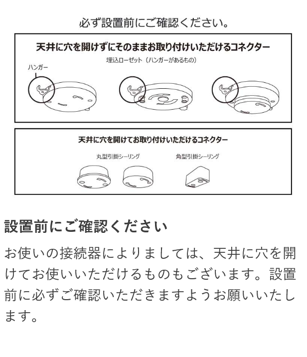 | ※注意事項 | 丸型、角型シーリングに取り付けの際は天井に木ネジを使用して固定する必要があります。 |