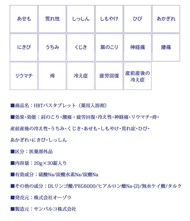 効果・効能:肩のこり・腰痛・疲労回復・冷え性・神経痛・リウマチ・痔・産前産後の冷え性・うちみ・くじき・あせも・しもやけ・荒れ症・ひび・あかぎれ・にきび・しっしん