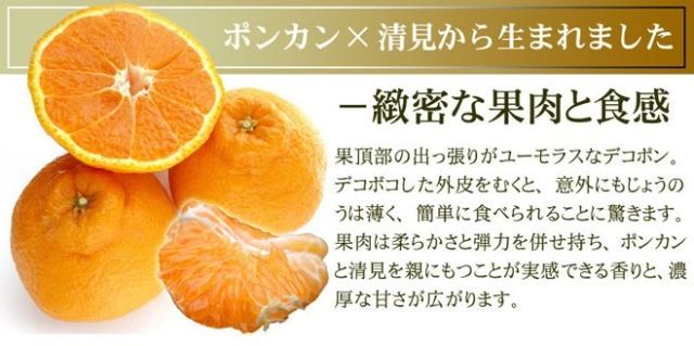 ポンカンと清見を交配して作られたかんきつデコポン。 熊本県産の「不知火」という品種の糖度13度以上のものを『デコポン』と呼んで商品化したのが始まり。その名のとおり果梗部に突起が出やすく、果皮全体がでこぼこしている。色は黄味が多くオレンジっぽくなく、成熟するとしなびてシワシワになるなど、外見上の悪さから、10年以上日の目を見なかったという経緯がある。その後、味の良さがじわじわと評判を呼び、近年一気に人気かんきつの仲間入りを果たした。