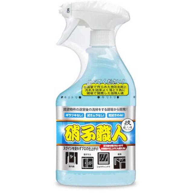 技職人魂の硝子職人は、パートさんなどがすぐに使えるように、塗布した後に乾拭きするだけでスクイジは不要!さらに静電気によるホコリの再付着を防止し、ギラツキを抑えて拭き跡をなくすので鏡やショウウィンドウなどにも幅広くお使い頂けます。