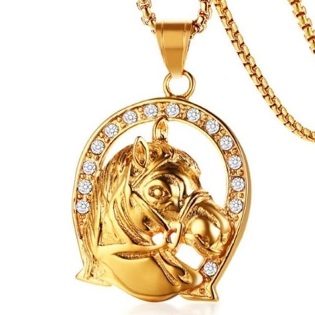 金メッキしたゴールド色の馬蹄にクリスタルのキュービックジルコニアをセットし真ん中に馬をデザインしたサージカルステンレス316L製のペンダントトップ。