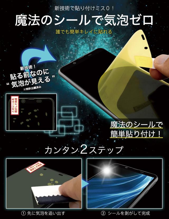 ● 貼る前に気泡がみえる!? “魔法のシール付き” ~ 貼り付けミス0。新技術!フィルムを貼る前に気泡が浮き出る!浮かび上がった空気を出してから簡単貼り付け。( ※特許出願済み )