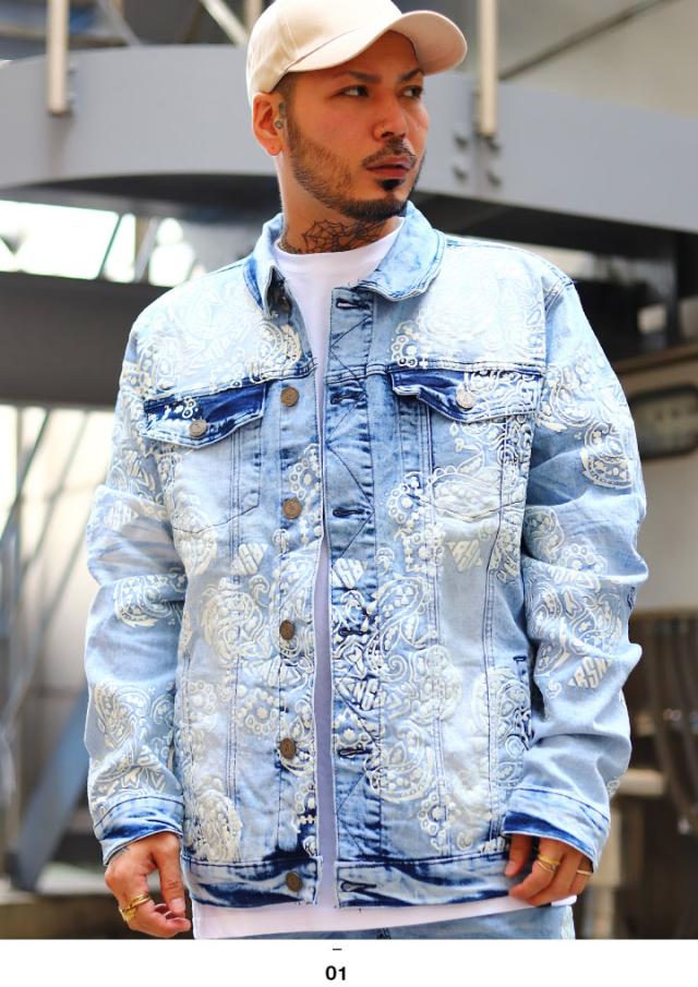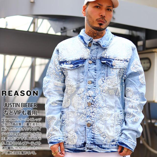 ラスト1点【50%OFF】REASON アウター 冬 長袖 Gジャン デニムジャケット メンズ インディゴライトブルー 大きいサイズ リーズン ジージャン ライトアウター おしゃれ かっこいい 総柄 ペイズリー柄 ウォッシュ b系 ヒップホップ ストリート系 ハイ ブランド 服 21秋冬 DN1