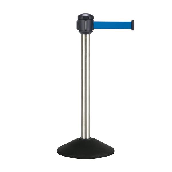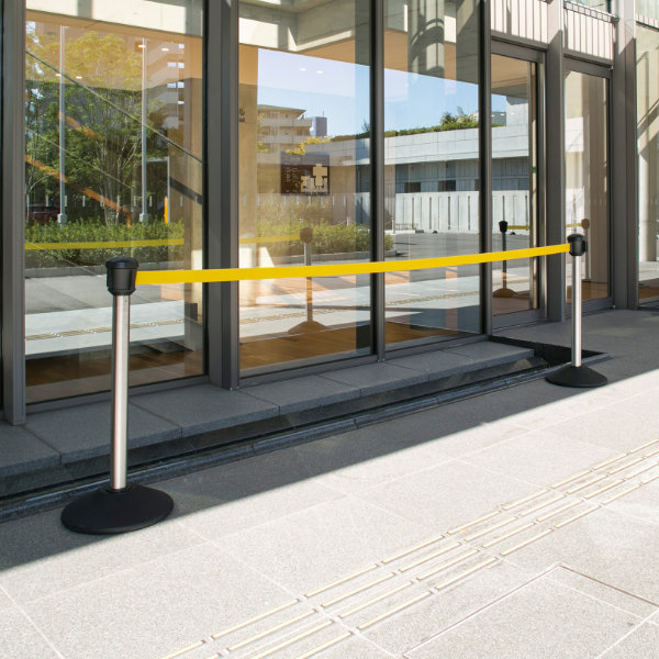 屋内でも屋外でも使えるロングストロークのベルトパーテーションです。3色展開で場所や区間に応じて色を変えたり、景観に合わせた設置が可能です。