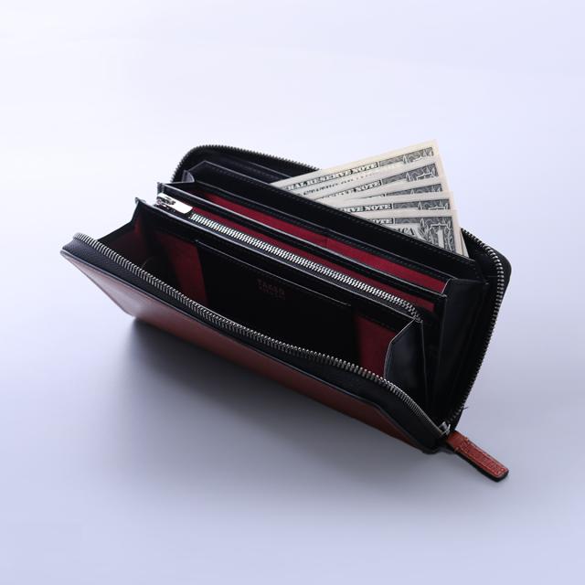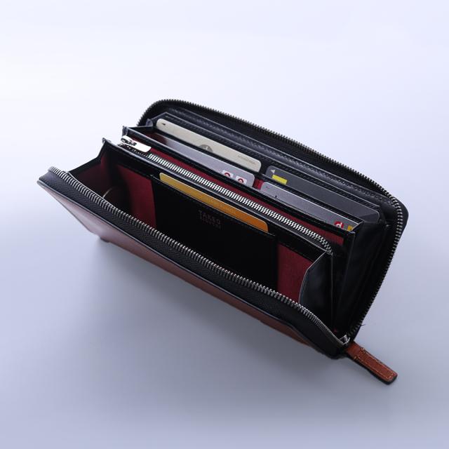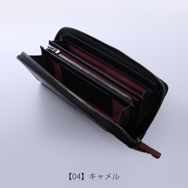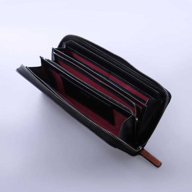 波状のエンボス加工を施した植物性タンニン鞣し牛革を使用し、付属をブラックで締めることでカジュアルダウンし過ぎない大人カジュアルな小物シリーズです。使い込むほどに色合いが深まり、艶感も増し、相棒として育てる経年変化も楽しめます。