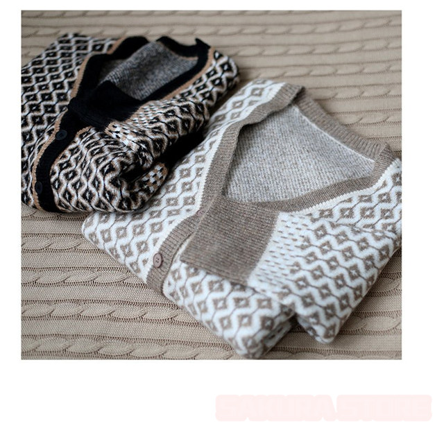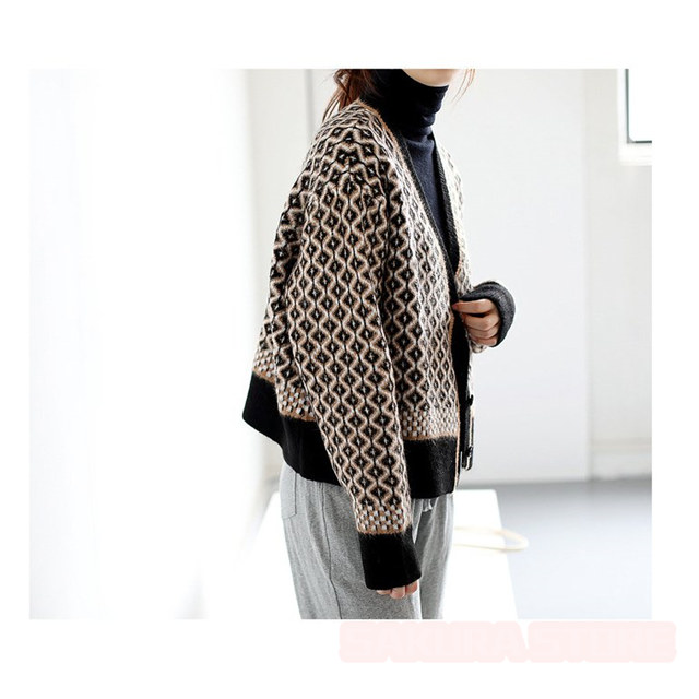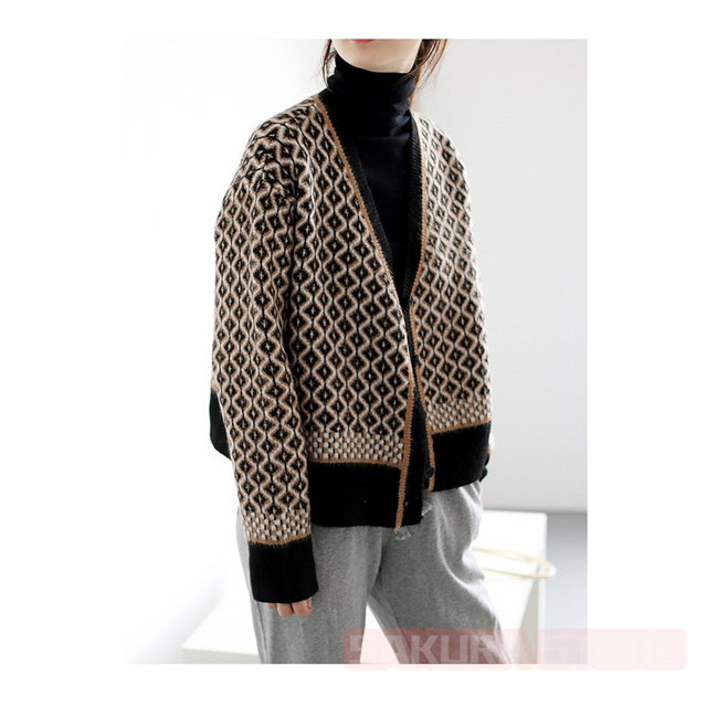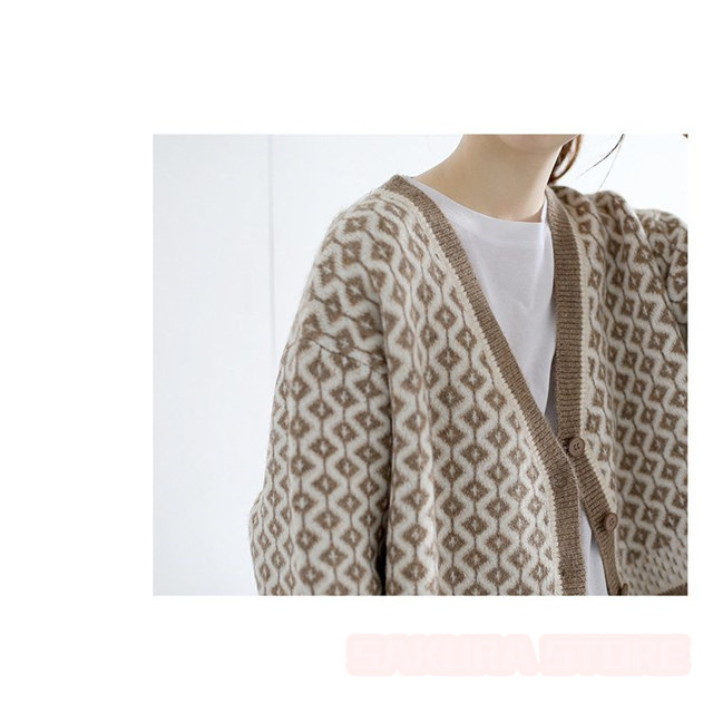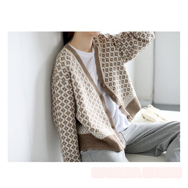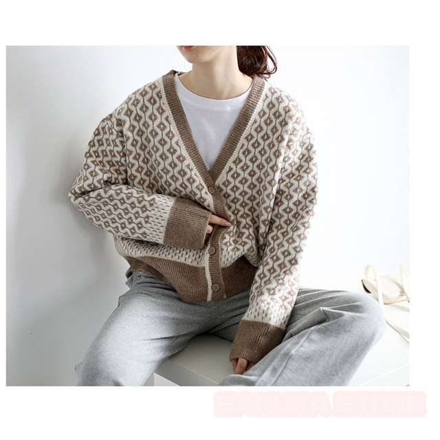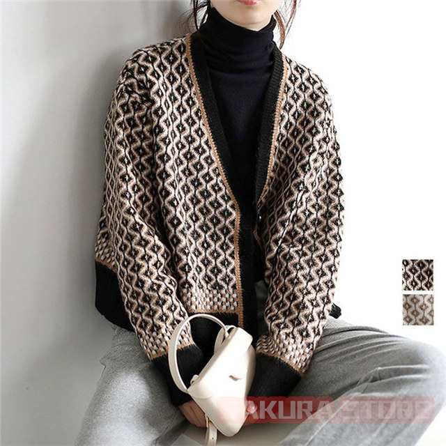 カーディガン レディース 幾何学柄 ジャガードカーディガン 配色ダイス柄 ニットカーディガン 長袖 セーター トップス アーガイル柄 羽織り 春秋冬 Vネック 厚手