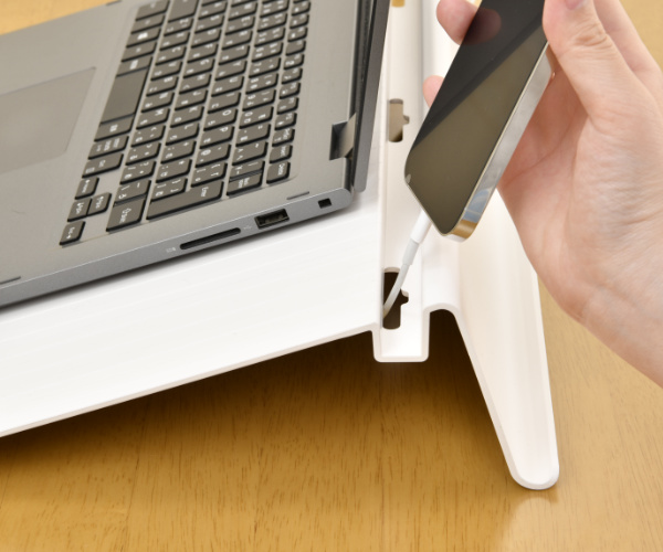 奥側の立てかける溝部分は、充電用のケーブルを通せる穴がついているので、充電をしながら、タブレットやスマホを立てて使用できるのも嬉しいポイントです。横向きも可能です。滑り落ちないように滑り止めシール付属です。