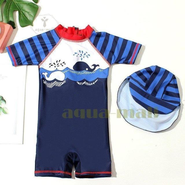 子供 男の子 水着 半袖 クジラ 鯨 かわいい カッコイイ ダンクブルー 小学生防水帽子付き 2点セット s、m、l、xl、xxl