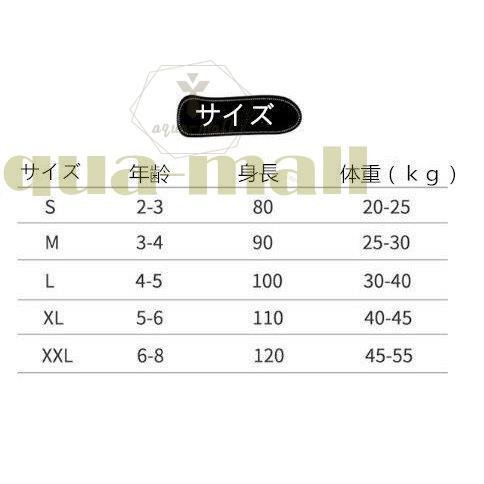 | サイズについての説明 | サイズ参考データ S: 年齢:2〜3歳 身長:80CM 体重:20〜25 M: 年齢:3〜4歳 身長:90CM 体重:25〜30 L: 年齢:4〜5歳 身長:100CM 体重:30〜40 XL: 年齢:5〜6歳 身長:110CM 体重:40〜45 XXL: 年齢:6〜8歳 身長:120CM 体重:45〜55 |